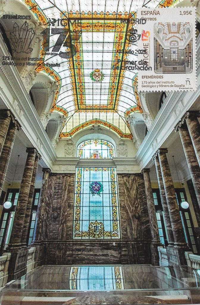 En la imagen del sello emitido por Correos para conmemorar esta efeméride, se muestra una de las vidrieras emplomadas de la emblemática sede central del IGME en la madrileña calle de Ríos Rosas. El edificio, declarado Bien de Interés Cultural en 1998, fue parcialmente inaugurado el 24 de mayo de 1926 con el solemne acto de apertura del XIV Congreso Geológico Internacional, bajo la presidencia del rey Alfonso XIII.